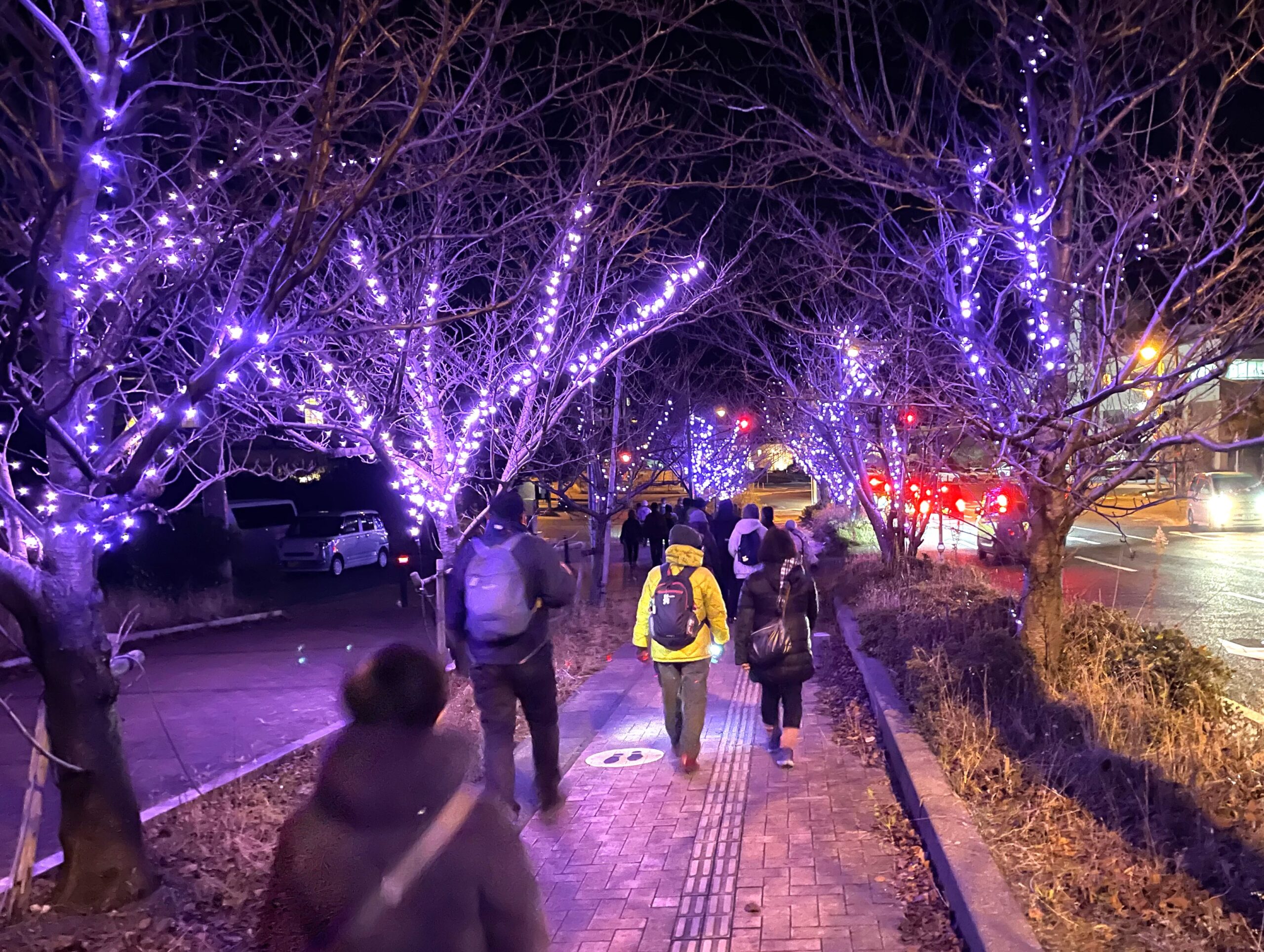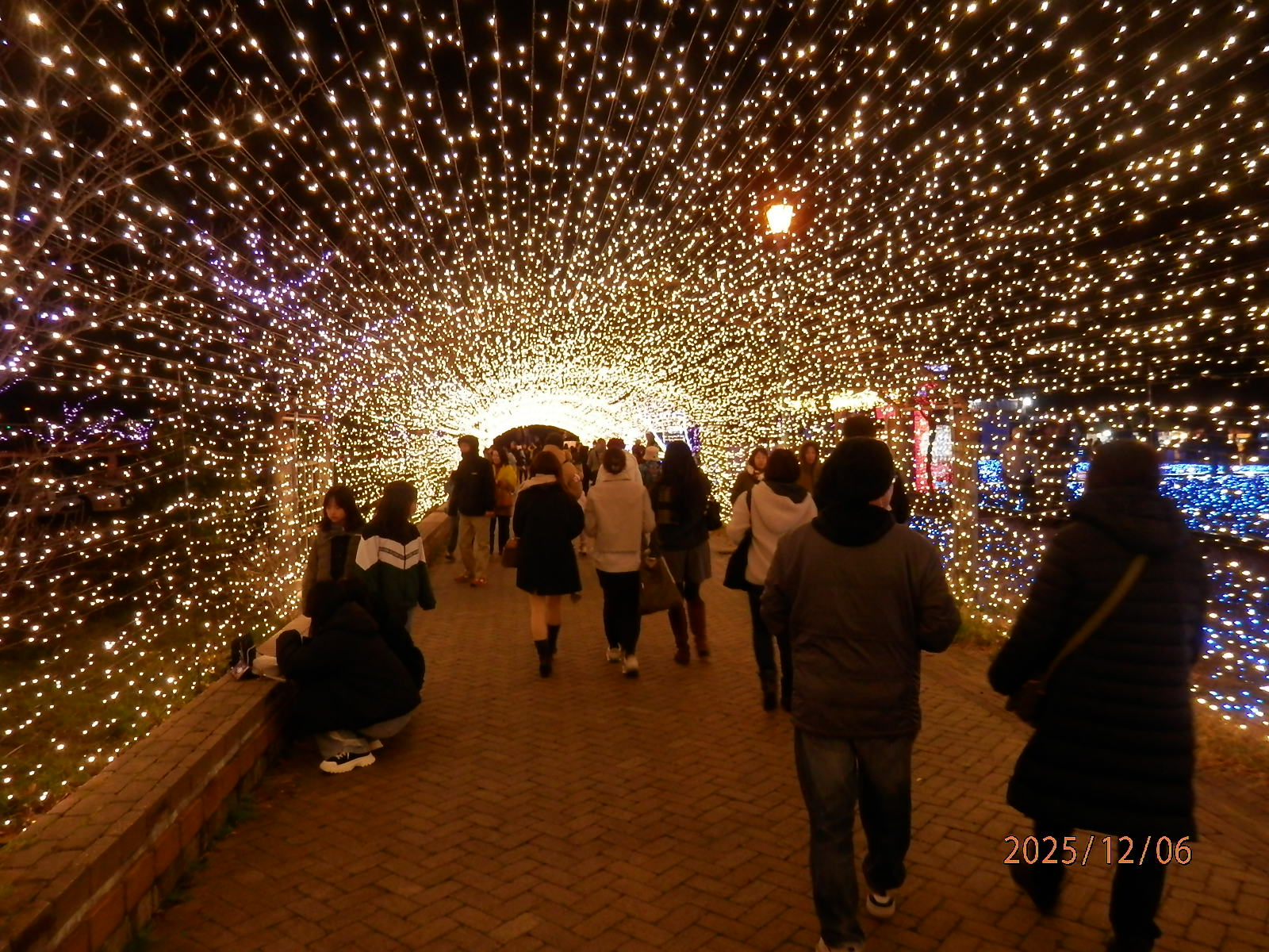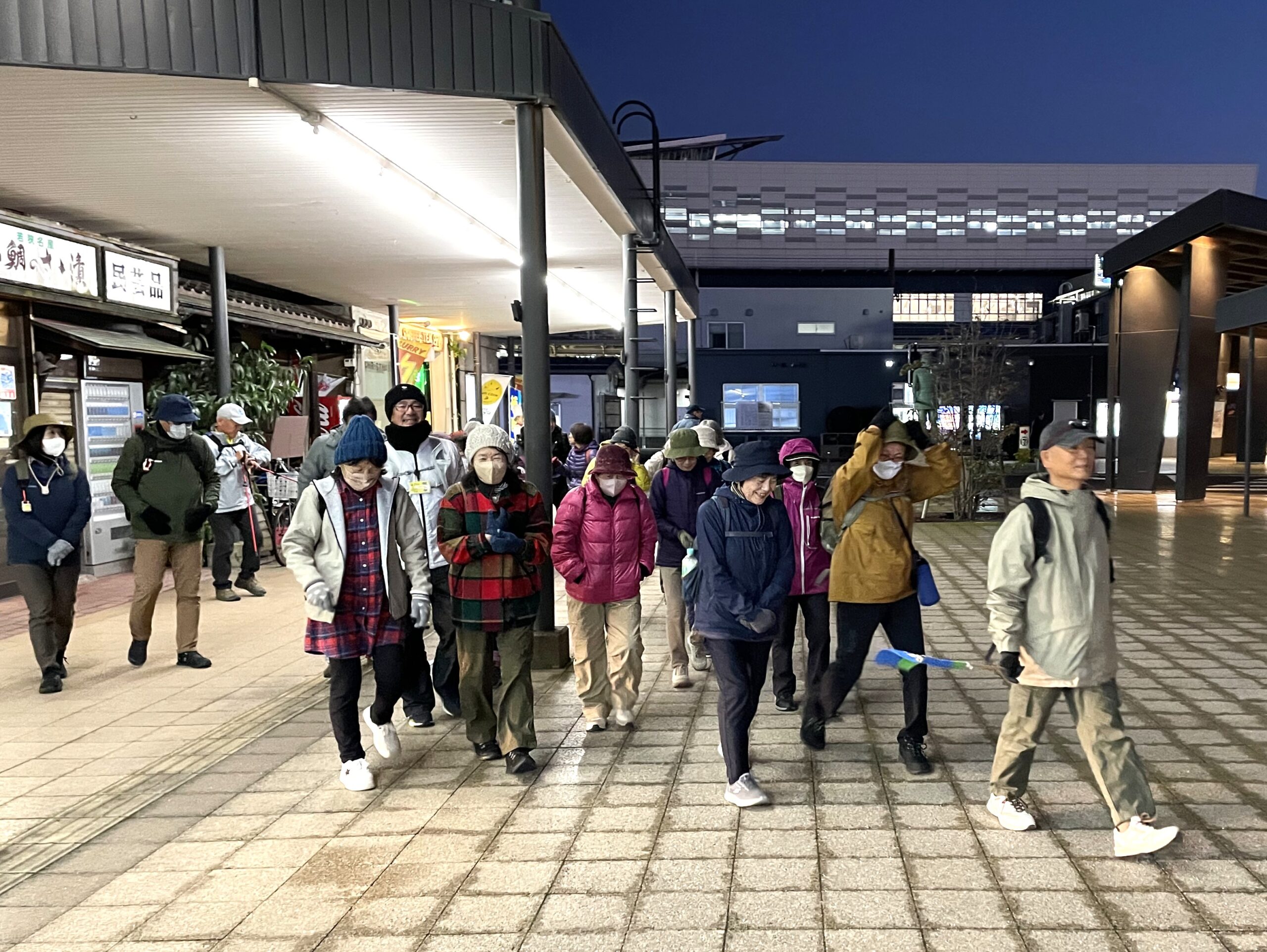 結果: 天候晴 気温7度 今回初めて晴天。敦賀駅広場ゾーンに会員17名、他協会5名、一般8名の計30名の参加者をお迎えした。HPを見て参加したとの声を一般の方より伺った。17時の開式の後17時15分 リーダー先導の元 一路ミライエ会場を目指す。天気も良く土曜日という事でアーケード街も人出が多く感じる。昼間は快晴であったが、やはり夜間ともなると冷え込みが厳しい。17時50分頃会場到着。集合場所と時間を伝え自由解散とする。18時のイルミネーション点灯時には会場内が一斉に「ワアー」と歓声が上がる。昨年までのような雨風も無く、ゆっくりと会場見学が出来、多数の観客の姿が見受けられる。18時45分集合 50分帰路スタートする。ライトアップされた気比神宮前を通り19時20分頃 敦賀駅に到着。今回 石川県や三重県からの参加者もあり満足いただけたでしょうか。寒い中 皆さん有難うございました。