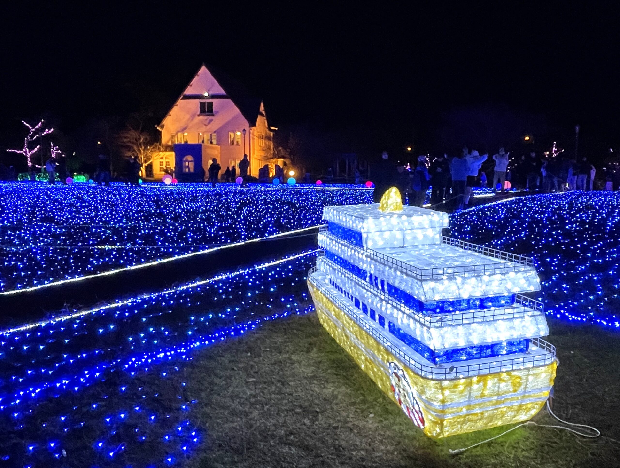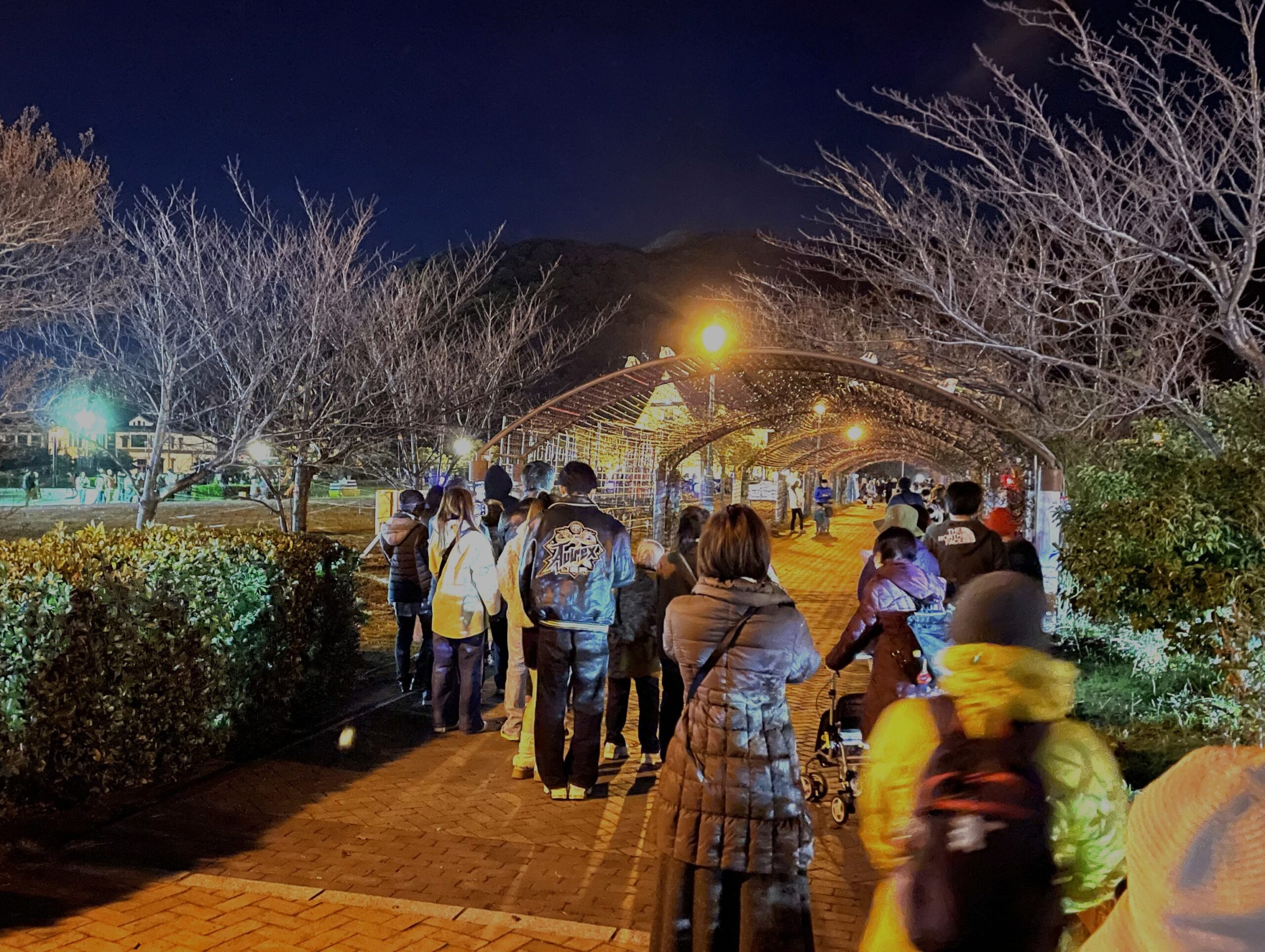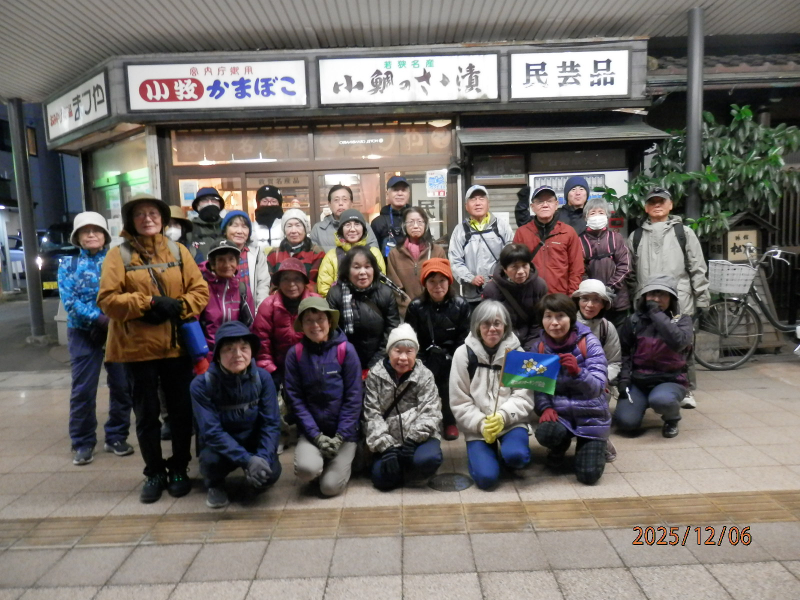 結果: 天候晴 気温7度 今回初めて晴天。敦賀駅広場ゾーンに会員17名、他協会5名、一般8名の計30名の参加者をお迎えした。HPを見て参加したとの声を一般の方より伺った。17時の開式の後17時15分 リーダー先導の元 一路ミライエ会場を目指す。天気も良く土曜日という事でアーケード街も人出が多く感じる。昼間は快晴であったが、やはり夜間ともなると冷え込みが厳しい。17時50分頃会場到着。集合場所と時間を伝え自由解散とする。18時のイルミネーション点灯時には会場内が一斉に「ワアー」と歓声が上がる。昨年までのような雨風も無く、ゆっくりと会場見学が出来、多数の観客の姿が見受けられる。18時45分集合 50分帰路スタートする。ライトアップされた気比神宮前を通り19時20分頃 敦賀駅に到着。今回 石川県や三重県からの参加者もあり満足いただけたでしょうか。寒い中 皆さん有難うございました。