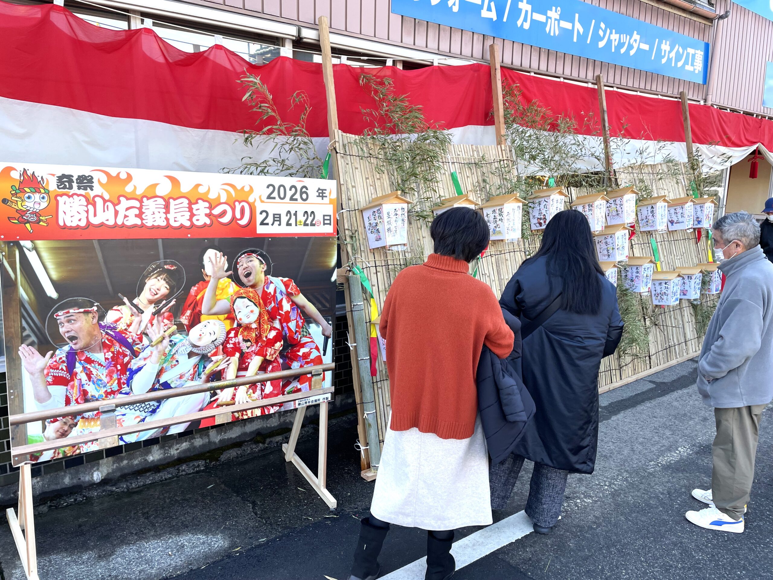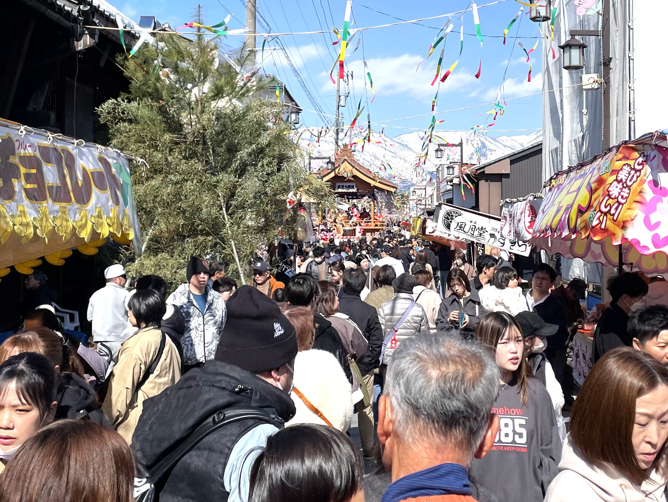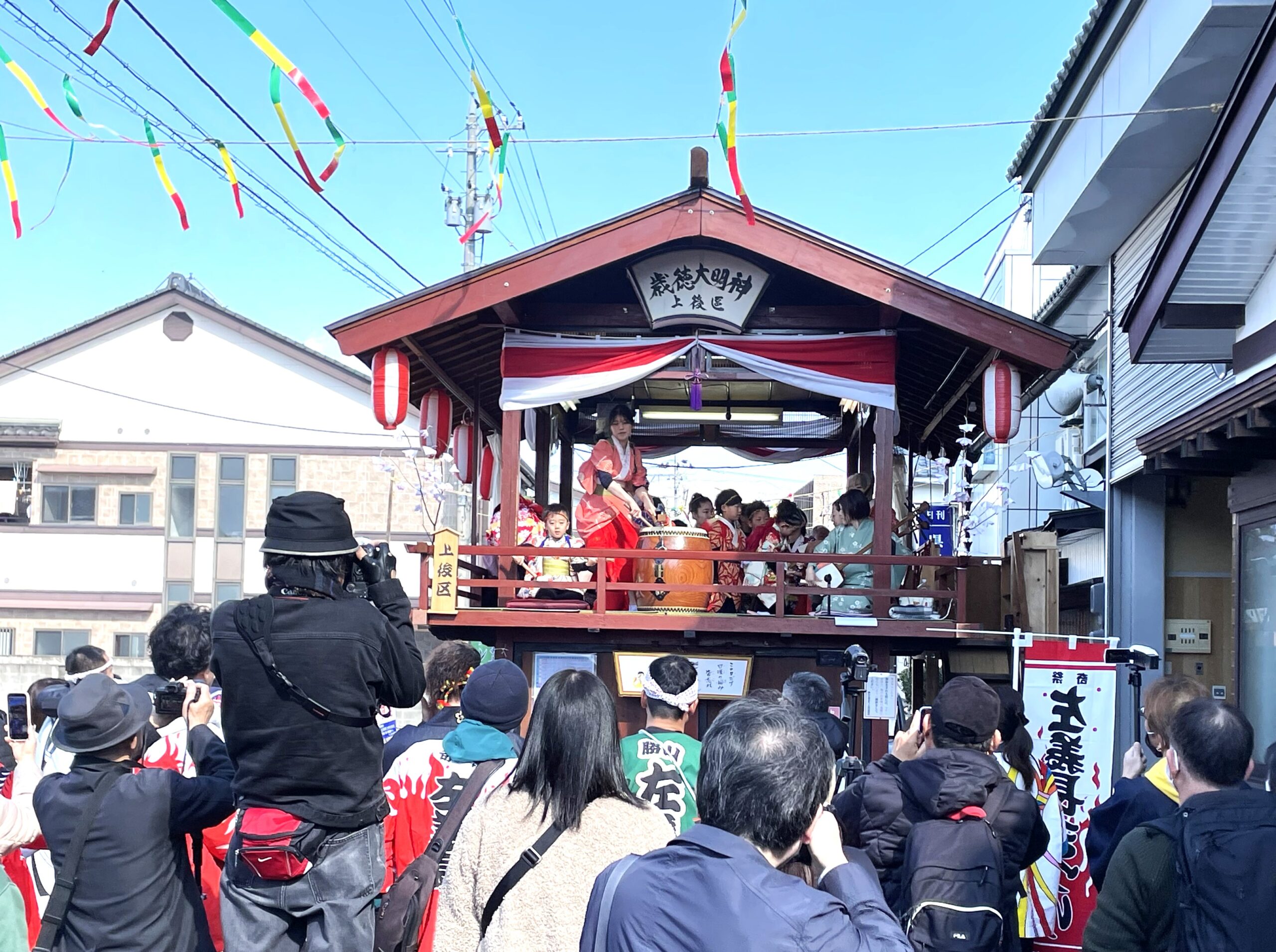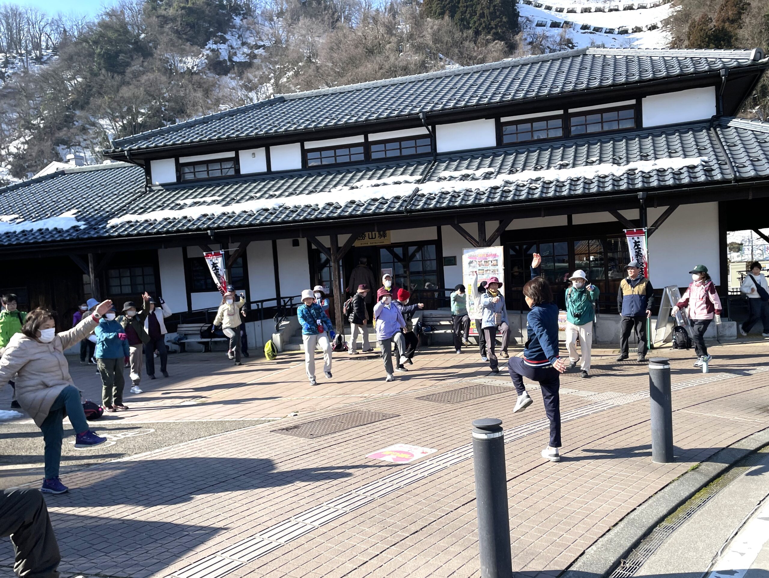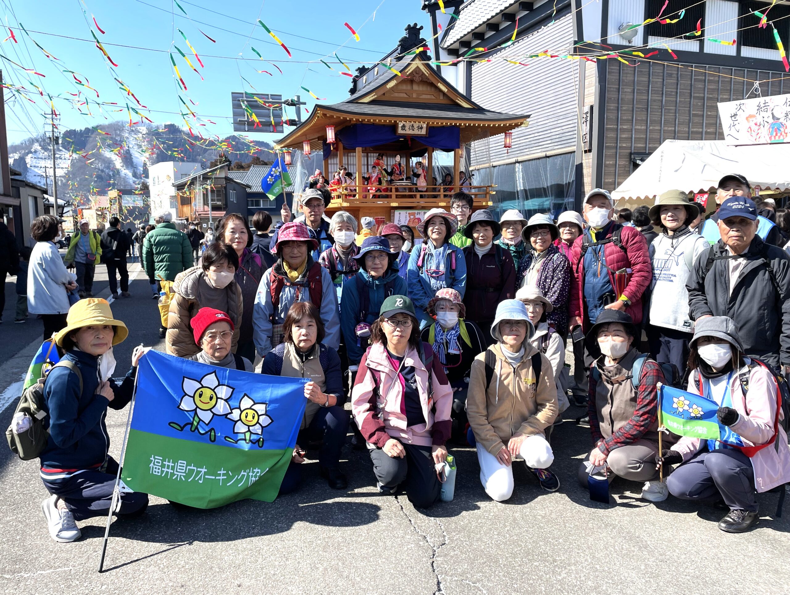 冬の勝山を熱くする、勝山左義長まつり。今年は例年にない晴天に恵まれて、昨日から熱い祭りが始まった。えちぜん鉄道勝山駅前で受付をして、祭りの会場に繰り出す。今回は福井歩こう会との共同開催となった。県協会は5Kmのショートコース、歩こう会は7Kmのロングコースを設定し、駅前広場で準備運動の後、9時50分スタートする。勝山橋を渡り、最初の祭り櫓は中後区。すでに三味線や笛太鼓の音が鳴り響き、櫓を見上げる大勢の人だかりが出来ていた。順に巡る櫓にはそれぞれの地区が飾りつけに趣向を凝らし、競い合っている。祭り半纏を着たお世話係の、見物客を見つめる目が優しい。道路の上にはロープが張り巡らされ、それに取り付けられた色とりどりの短冊が風に揺れ、下を歩く人の祭り気分を盛り上げる。今日はいつものウオークとは異なり、祭りの見物がメインなので人ごみの中をゆっくり歩く。櫓の前ではしばし立ち止まり、お囃子のテンポと踊りのしぐさに引き込まれ、思わず浮き浮きした気分になる。「浮き太鼓」とは素晴らしいネーミングである。11か所の会場を巡り、見物客でごった返すまちなか広場にゴールした。祭りの会場を後にした帰りには、また来年も太鼓の音に誘われて歩こうと、そう思わせてくれる一日でした。